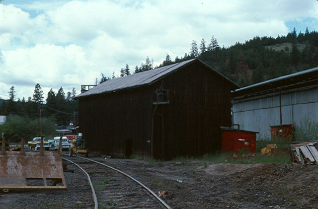 Photographic records tend to indicate that Kinzua has featured at least two enginehouses. The first was a multiple stall structure, with a single stall wood structure built to replace it about the time that the diesel arrived. These two pictures show the later single stall enginehouse at the time that the scrapping of the railroad and the sawmill had just begun. Note that the tracks have been removed from the building. John Henderson photographs, Jeff Moore collection. |