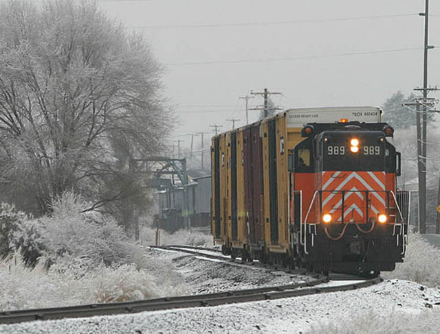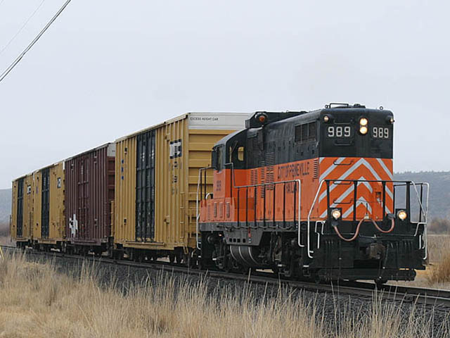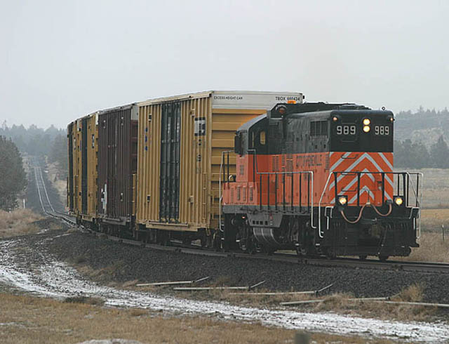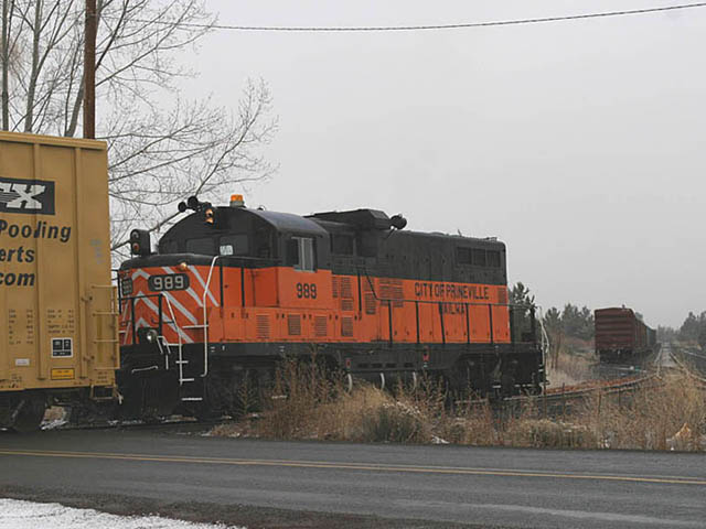 #989 rounding the north leg of the wye at Prineville Junction. The cars in the background are former incentive per diem boxcars in storage on the railroad. |