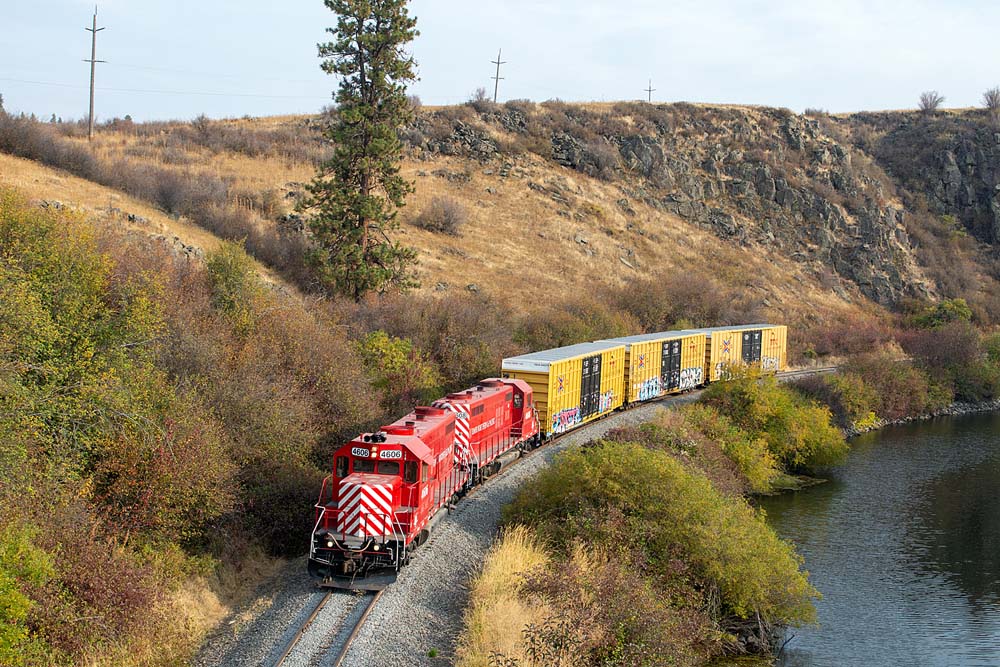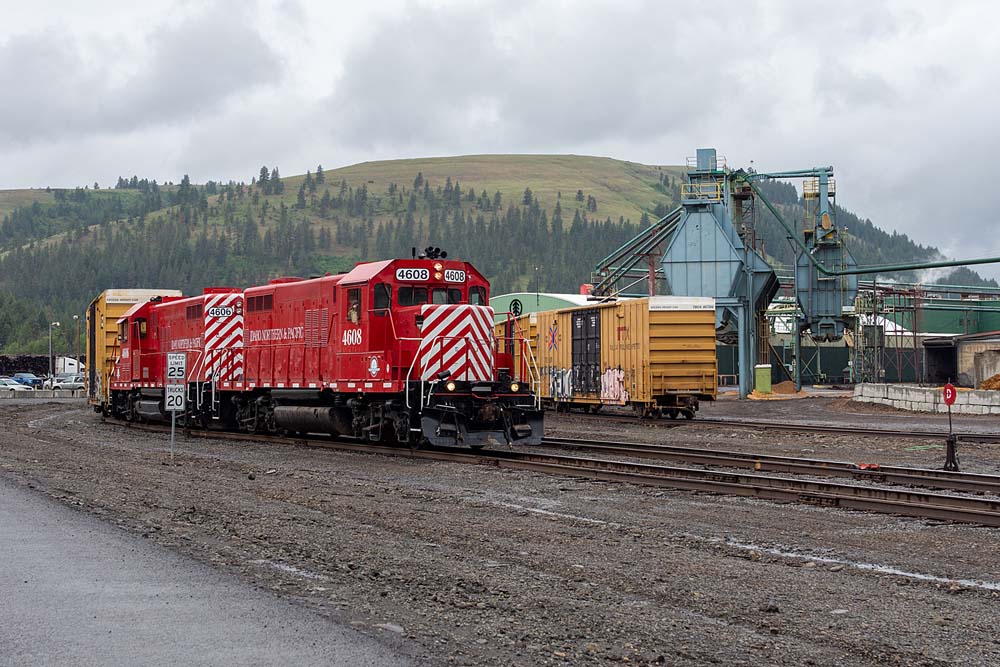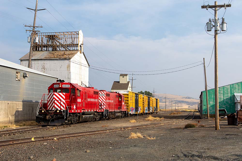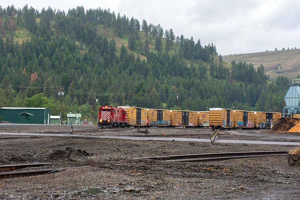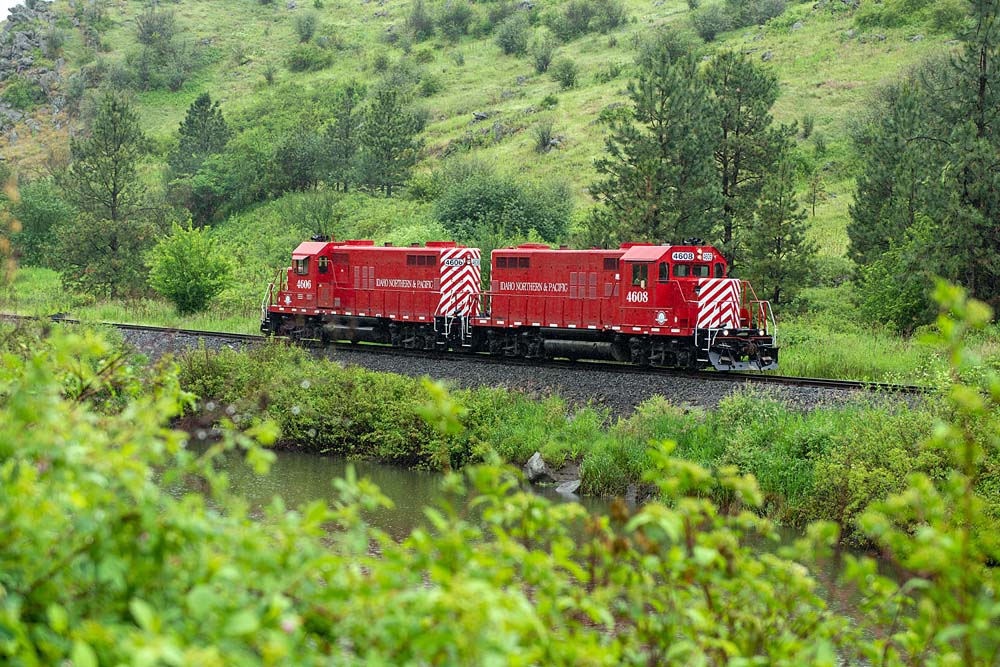 On 15 June 2020 Jonathan Fischer followed an Idaho, Northern & Pacific freight as it headed north with just the two locomotives from Island City to Elgin, switched the Boise-Cascade mill in Elgin, then