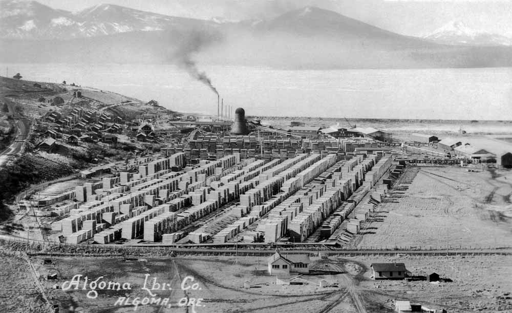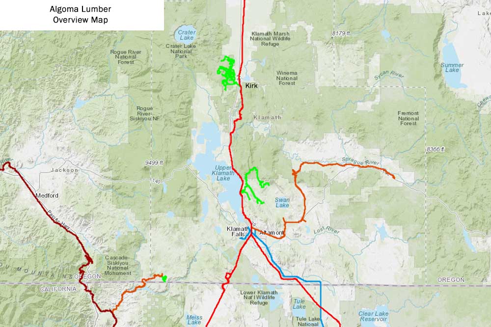 History The Algoma Lumber Company got its start as a joint venture between Frank Paige Fay and his nephew E.J. Grant. The company initially existed primarily to supply Fay's Faye Fruit Company with box shook, the industy term for the pieces of a wooden shipping box that would be shipped bundled together from a box factory to the point of use, where the pieces would be assembled into a box. In 1905 Algoma built a box factory adjacent to a sawmill operated by the Bridgeford-Cunningham Lumber Company at Algomah on the line of the McCloud River Railroad Company in northeastern California. Algoma filed a lawsuit against the Bridgeford-Cunningham company in early 1907 after learning B-C operated the mill and timberlands and a lessee, when in fact they had represented themselves as owning the operations at the time the two parties signed the original agreement. That development apparently caused Algoma to start looking elsewhere, and they shortly built or bought a box factory at Montague, California. The Montague factory needed a lumber source, and instead of contracting lumber from a sawmill Algoma decided to enter the lumber manufacturing business directly. Algoma located some timberlands and a sawmill site near New Pokegama, at the end of the Klamath Lake Railroad. The sawmill opened in 1908 and started shipping lumber over the Klamath Lake and Southern Pacific railroads to the Montague box factory. The operation, including logging railroads built into the timber, operated successfully until 1911 when the timber ran out. Algoma initially purchased the small 0-4-2T locomotive named Old Blue and four log cars from the Pokegama Sugar Pine company, later supplemented by an ancient 1872-built 4-4-0 purchased from the Southern Pacific and named the Helen Grant in honor of E.J. Grant's wife. The end of operations at Pokegama forced Algoma to look for a new home for their operations. The company quickly found a new sawmill site at Rattlesnake Point north of Klamath Falls, and it brought the Helen Grant, the four log cars, and the rails from Pokegama to the new site. Algoma also moved the Montague box factory north to the new sawmill as well to consolidate all of their operations to a single plant. The new sawmill opened in 1914. The company's first logging railroad ran up Plum Valley to the southeast of the mill, but access to any further timber required the company to build a 2,600-foot long incline that ran up the side of an 800-foot tall rimrock cliff near the sawmill, which they completed in 1915. The logging railroads spread out north and south from the top of the incline. Logging remained active in that area until 1918, when the timber ran out. Algoma's next move took it north to Kirk and to a large block of timber on the Klamath Indian Reservation the company won in 1917. Algoma promptly broke ground on a new logging railroad running west into the timber. Logging in this area lasted until 1929 when the timber was again exhausted. Southern Pacific supplied the log flats that hauled the logs from Kirk back south to Algoma. Algoma's final rail logging operation involved harvesting fire damaged timber plus another newly acquired block of timber in the Swan Lake and Antelope Valley areas, which required the company in late 1926 or early 1927 to rebuild the incline and several miles of the old logging railroads above the incline. A 1926 Lumber Industry Directory described Algoma's operations as follows: "Algoma Lumber Co., 205 Fay Bldg., Los Angeles, Cal.; camp post office, Algoma; daily output, 200M; 2 sides; 400 men; machine shop; commissary; electric light plant; air compressors; 1 McGiffert loader; 6 logging tractors; 6 sets big wheels; 24 horses; route supplies via Southern Pacific; camp telephone viat Klamath Falls; manager, E.G. Grant; superintendant and purchasing agent, Matt Egan; master mechanic, Fred Stewart; 10 miles s.g. track; 60 lb. rail; 2 rod locomotives; 60 flat cars; 6 moving cars; maximum curvature, 4 degrees; locomotive fuel, oil; trucks and flat cars supplied by the Southern Pacific railroad." Algoma operations lasted until 1935, when the company shifted its operations to several more blocks of newly acquired timber, but delivering those logs to the mill was accomplished only by trucks and log rafts on Klamath Lake. Algoma sold the remaining timber above the incline and the railroad to Kesterson Lumber Company, who continued operating it until the timber ran out in 1941. The Algoma mill would only last another two years, as a lack of any additional timber to cut forced the mill to close forever on 11 April 1943. Concrete foundations from the mill, the grade of the incline and many miles of logging railroad grades, and at least one large trestle remnant mark the operation today. |