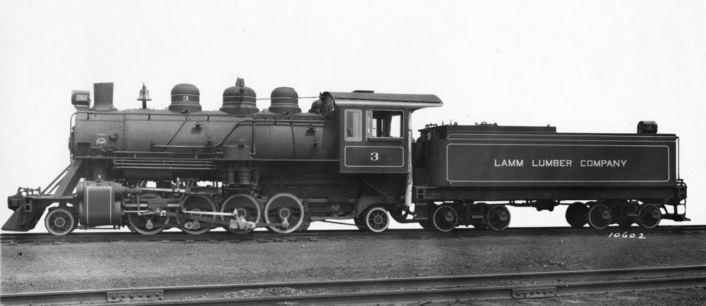 Locomotive Roster 1:1- Lima 2-truck Shay, c/n 798, Built 1903. Cylinders 8x12, Drivers 26.5", Tractive Effort 14,950 lbs., Weight 32 tons. Built as Clark Creek Logging Company #2, Kelso, WA; to Lamm Lumber #1. At least one source has it renumbered to Lamm #2. Used as a stationary boiler at Modoc Point mill for many years. Scrapped 1943. 1:2- Lima 2-truck Shay, c/n 2722, Built 1913. Cylinder 10x12, Drivers 29.5", Tractive Effort 16,900 lbs., Weight 42 tons. Built new for Pelican Bay Lumber Company #2, Klamath Falls, OR; to Lamm Lumber Company #1:2. Scrapped 1951. 2- Heisler 2-truck, c/n 1254, Built 1912. Weight 62 tons. Built at Horseshoe Lumber Company #7, River Falls, AL; to Jordon River Lumber Company, Kiln, MS; to Edward Hines Yellow Pine Trustees, Kiln/Lumberton, MS; to Northwestern Pacific Railroad #255, Sherwood, CA; Leased to Northwestern Redwood Company; to Shaw-Bertram Lumber #2, Kirk, OR; to Lamm Lumber Company #2, Modoc Point, OR; Wrecked and scrapped 1931. 3- Baldwin 2-8-2, c/n 61306, Built 1930. Cyliners 19x24, Drivers 44", Tractive Effort 31,900 lbs., Weight 80 tons. Purchased new; to California Western Railroad #44, Fort Bragg, CA, 1944. Scrapped 1952. 4- Alco/Cooke 2-6-2, c/n 62515, Built 1920. Drivers 48", Tractive Effort 29,900 lbs., Weight 72 tons. Built new for Pelican Bay Lumber Company #3, Klamath Falls, OR; to Lamm Lumber Company #4; to Ventura County Railway #3, Ventura, CA, 1944. 4:2- Lima 4-6-0, c/n 1034, Built 1906. Cyliners 7x24; Drivers 48"; Tractive Effort 22,100 lbs., Weight 53 tons. Built as Horseshoe Lumber Company #4, River Falls, AL; to Forest Lumber Company #4, Pine Ridge, OR; to Lamm Lumber Company #4. Scrapped June 1947. |