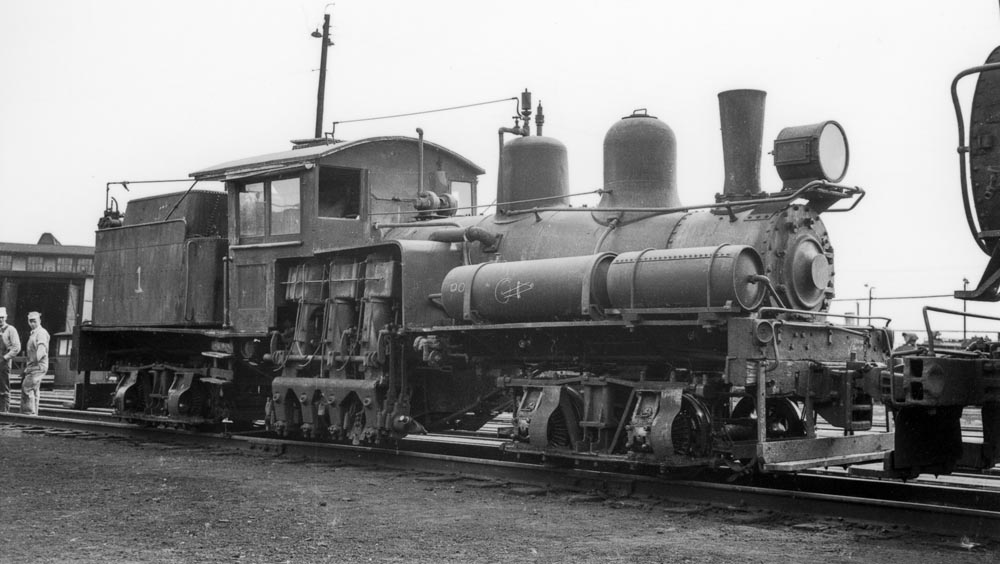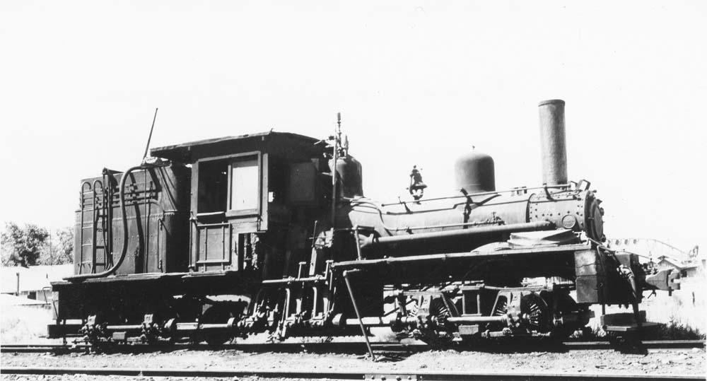 Lamm Lumber's Shay #1:1 at Modoc Point on 13 August 1937. The small Shay had already been converted to a stationary boiler by this point. R. Searle photograph.