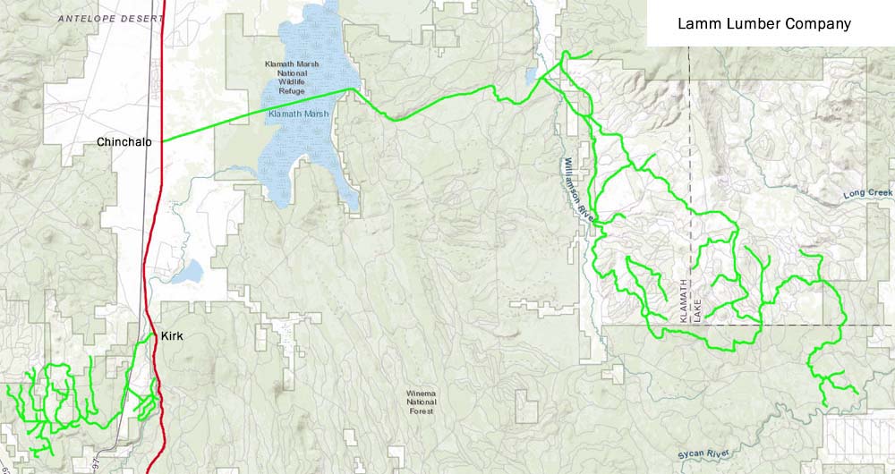 History W.E. Lamm launched the Lamm Lumber Company in October 1914. The company's first operations in 1916 involved logging a tract of mostly pine timber on the west side of Klamath Lake, with the logs hauled to the shoreline by animals and then rafted across the lake to a sawmill Lamm leased. In later 1916 Lamm bought the partically built Pine Tree Lumber Company mill at Lelu, later renamed Modoc Point, located twenty miles north of Klamath Falls. Once completed Lamm started sawing the logs floated across the lake at that mill. Meanwhile, Lamm's contract logger Nicole Brothers had started construction on a logging railroad running from the west shore into the timber that eventually extended about three miles from the lake. In 1917 Lamm acquired a large block of timber on the Klamath Reservation located southwest of Kirk, and in 1919 Lamm shut down the logging show on the west side of the lake and started building a new railroad into the new timber from the SP mainline at Kirk. This railroad was extended several times as the loggers moved deeper into the woods. A 1926 Directory of the Lumber Industry described the company's operations as follows: "Lamm Lumber Co., Modoc Point; camp post office, Kirk; daily output, 150M; 1 side; 100 men; machine shop; commissary; electric light plant; air compressors; 1 McGiffert loader; 4 logging tractors; 5 sets big wheels; 42 horses; route supplies via Kirk; camp telephone via Klamath Falls; manager, W.E. Lamm; superintendent, Claude Houghton; purchasing agent, D.H. Crump; 11 miles s.g. track; 50 lb. rail; 1 geared locomotive; 2 sets disconnected trucks; 5 flat cars; 1 moving car; 1 tank car; 1 speeder; maximum grade, 4 per cent; maximum curvature, 10 degrees; locomotive fuel, oil; trucks and flat car supplied by the Southern Pacific railroad." The timber on the Kirk line finally ran out in 1929, at which time Lamm abandoned that railroad. However, Lamm was far from done as it was just launching what would be one of the largest single railroad logging shows in the basin, excluding of course the massive Weyerhaeuser operations. In 1928 the company bought 37,000 acres of prime timber from the Long-Bell Lumber Company, which would require a forty mile long railroad built east from a connection with the Southern Pacific at Chinchalo. Lamm contracted the first part of the construction job to F. Hill Hunter's Sawmill Engineering & Construction Company, which included trying to build a fill across the Klamath Marsh in winter time conditions. The Hunter crews after much trial and error and difficulty finally got a diesel powered clamshell shovel floated on a barge, which gradually dug the frozen muck out of the marsh bottom and dumped it to build a new roadbed six feet above the marsh surface. Once the fill was complete the job of bulding track and ballasting began, which proved to be a difficulat and very dangerous job as the tracks even with a lot of wood bracing sank as much as 18 inches underneath the locomotive in most places. The engine looked "like the Leaning Tower of Pisa" most of the time while on the fill according to a writer for The Timberman who witnessed parts of the work. However, the job eventually got done, and Lamm settled down to hauling logs out of the tract to the SP for delivery to the Modoc Point mill. Two other logging railroads, Kesterson Lumber and Pelican Bay Lumber, both built logging railroads of their own off of the Lamm railroad; the Kesterson railroad caused Lamm some troubles, as it had counted on a contract to haul their logs to help finance the enormous cost of the new logging railroad, but Kesterson only shipped a small fraction of the required board feet before defaulting on the agreement. Lamm later brought suit against Kesterson, but eventually settled for some used logging equipment and Kesterson's idled railroad. Long-Bell Lumber also loaded logs onto railcars at a couple points on the Lamm railroad, but did not otherwise build any lines of their own. Lamm Lumber paid dearly for the choice to run the railroad across the Marsh as the roadbed continually sank into the muck and required constant rock dumping and jacking and other maintenance to keep the line passable. Joseph H. Pierre in his fine book Whan Timber Stood Tall about his life working mostly in the timber industry wrote about a summer he spent during the depths of the Depression working for Lamm. The company was one of the few offering employment in the industry at the time, and Pierre got his foot in the door because of a friend of his who knew the Lamm woods superintendant. Pierre spent three weeks on the Lamm section gang, mostly working on the marsh trackage and correcting sunk kinks before a spot opened up for him in the woods. Pierre related one other interesting story about his time with the company, after several weeks working on the logging side the company promoted him to the cat hostler position, which spent every night at the landing servicing the Caterpillar tractors and McGiffert loader. Among the tasks was draining the water out of the cats each night and then refilling them the next morning, and then starting the cats before the loggers arrived for work. Firing up the tractors was accomplished by manually spinning the flywheelmeans of with a starting bar, but the tractors had accumulated so much dust in the starting mechanisms that getting them going was very difficult to impossible on most mornings, and the mechanic refused to overhaul the cats. On his second night on that job Pierre came up with a solution in which he would park the five cats- four of them Caterpillar "Sixty" tractors and one "Thirty" that the crews referred to as the kitten- at the top of a nearby rise, where he drained them. When the time came to get them started he would coast them off the hill and pop the clutch as they rolled towards the landing, he would then bring them to a stop as he reached the landing where he would immediately grab the hose and refill the radiators