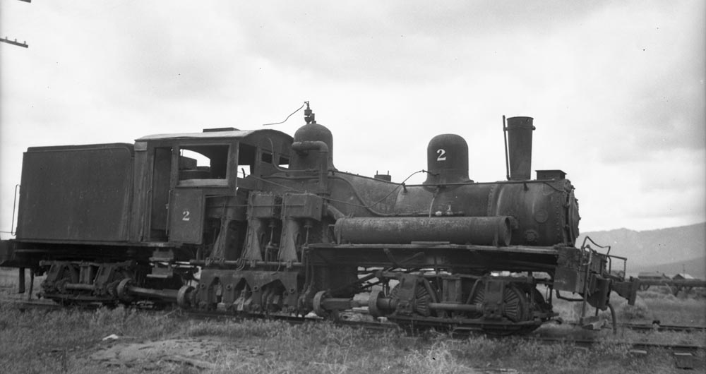 The former Wheeler-Olmstead Shay stored derelict at Macdoel, CA, on 15 June 1936. D.S. Richter photo.