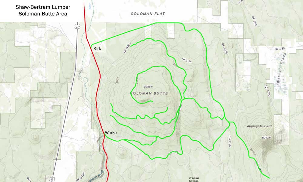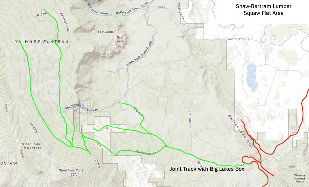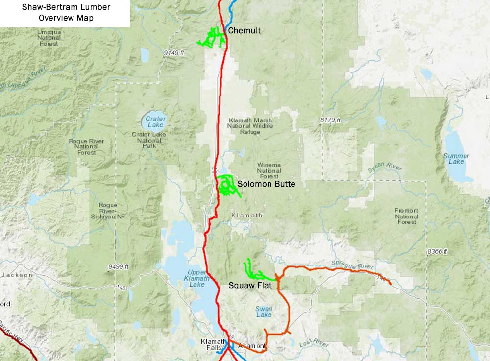 History F.R. Shaw, an experienced lumberman from Portland, won the bidding on 11,700 acres of Klamath Indian Reservation timber southeast of Kirk in June 1920. Shaw shortly partnered with W.J. Bertram to incorporate the Shaw-Bertram Lumber Company, which started building a mill on the shores of Lake Ewauna. The company established a connection with the Southern Pacific at Kirk and arranged to share the the first two miles of Modoc Lumber Company's line running east from that point, at which point the Shaw-Bertram railroad turned south to access their own timber. The railroad eventually wrapped around the east and south sides of Solomon Butte, and in 1925 the company abandoned its SP connection at Kirk in favor of a new connection at Warko. The 1926 Directory of the Lumber Industry described the company's operations as follows: "Shaw-Bertram Lumber Co., Klamath Falls; camp post office, same; daily output, 180 M; 1 side; 90 men; donkey engines; machine shop; commissary; electric light plant; air compressors; 5 logging tractors; 5 sets big wheels; 30 horses; manager, J.R. Shaw; superintendent, J.F. Potter; purchasing agent, E.O. Shaw; 13 miles s.g. track; 50 lb. rail; 1 geared locomotive; 60 flat cars; 2 moving cars; 1 speeder; maximum grade, 5 per cent; maximum curvature, 16 degrees; locomotive fuel, oil." Logging in the first unit lasted until the end of 1928, when the timber ran out. The company by then had secured another large tract of Reservation timber in the Squaw Flat area in 1924, and in 1927 the company broke ground jointly with the Big Lakes Box Company on a new railroad running west from the Oregon, California & Eastern's Squaw Flat station. The two companies built the joint trackage under the "Squaw Flat Logging United" banner in 1926. Shaw-Bertram continued building its mainline through the Squaw Flat unit in 1927, but logging did not commence until the Solomon Butte operation closed down near the end of 1928. By this point the company had fully transitioned from horse to tractor logging. The company expanded again in late 1927 when it purchased 22,000 acres of timber from another private owner centered just west of Chemult. Southern Pacific and Great Northern would split the log haul south to Klamath Falls. Shaw-Bertram leased and reopened the Wheeler-Olmstead sawmill just north of Klamath Falls to process the Chemult timber as it did not have enough capacity at the main plant to process both it and the timber coming out of Squaw Flat. This operations lasted until the company exhausted the timber in the Chemult tract in 1930. Shaw-Bertram bought additional large units of Reservation timber in 1928 and 1929 that would have secured the company's future for a decade and a half after the Squaw Flat timber ran out, but in the end the company could not survive the Depression and the Klamath Falls mill shut down in 1932. The company ended up selling the timber units it acquired to others. F.R Shaw later built and operated a sawmill in northern California for a few years in the early 1940s, and then in 1943 he purchased another sawmill in Klamath Falls fed by truck logging he operated as the Modoc Lumber Company that ran until 1995. |