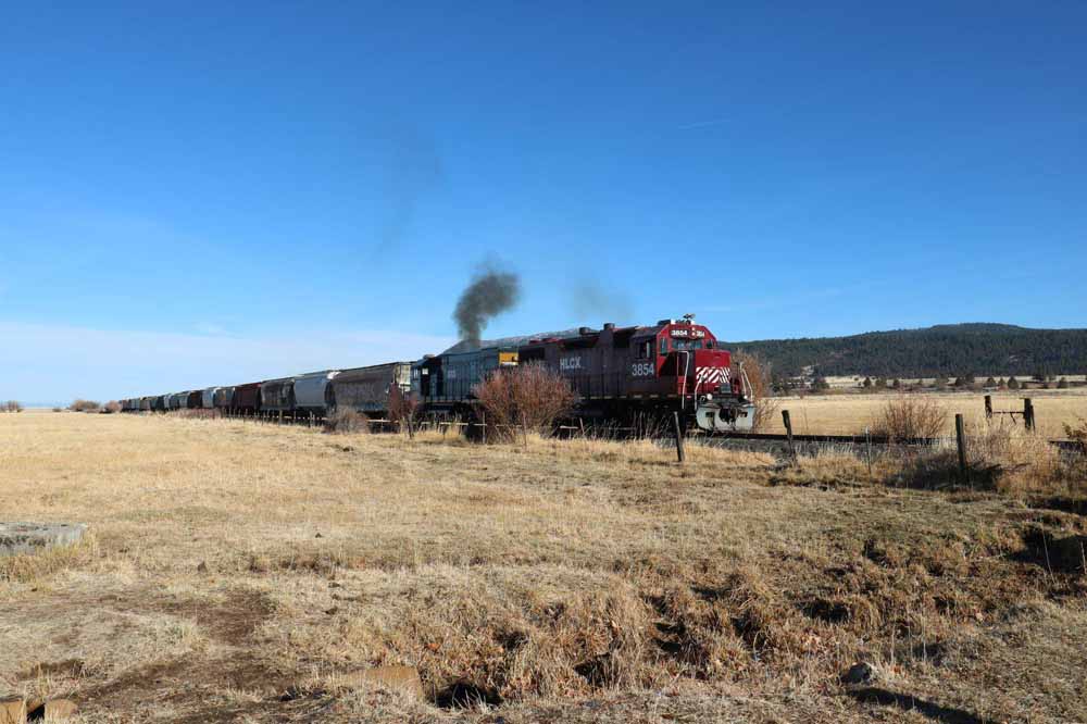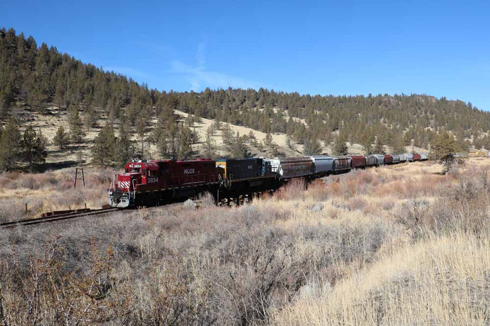 On Saturday, 28 November 2020 Tom Mueller caught the southbound Goose Lake Railway freight and followed it from just south of Davis Creek down to the Pit River canyon. Power was GP38-2 #3854 and newly arrived GP15-1 #106 pulling thirteen perlite and seven lumber loads. Tom sent along the following four photos of the chase. |