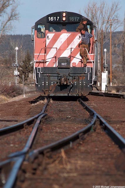 Two members of the train crew preparing to get off the locomotive to do the switching at Alturas. |