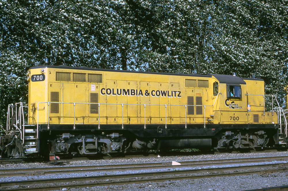 The demise of the Chehalis Western prompted Weyerhaeuser to transfer the locomotive to its common carrier subsidiary Columbia & Cowlitz out of Longview, Washington, where Keith Ardinger caught it working on 5 June 1992. |