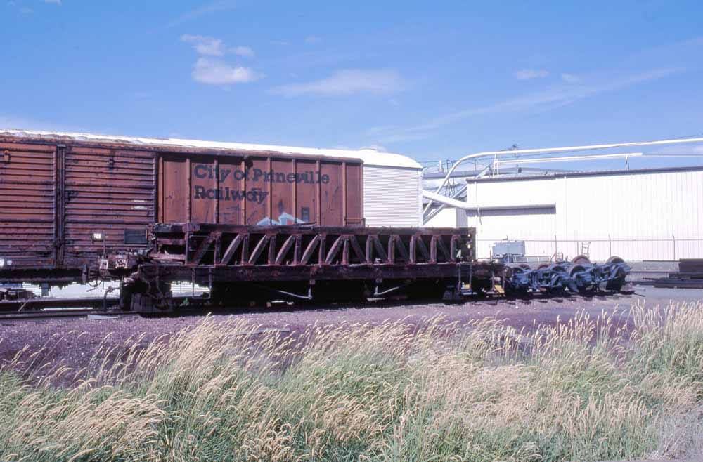 ![]() Weyerhaeuser "loggers special" ballast car #231 got stranded at a cinder pit north of Sycan. The car sat in this position for years until Martin Hansen acquired the car and moved it to Prineville for a planned restoration for use with the former Mt. Emily Lumber Shay #1 that never came to pass. The disassembled pieces of the car remain in Prineville as of this writing. John Henderson photo, Jeff Moore collection. ![]() Another view of the #231 abandoned at the cinder pit. John Henderson photo, Jeff Moore collection. ![]() John Henderson later photographed the pieces of the #231 in Prineville adjacent to the City of Prineville shops. The car has since been relocated to some open ground off the rails but still near the enginehouse. Jeff Moore collection. ![]() The body of an old side dump hopper on the ground at Sycan in 1973. Jerry Lamper photo. ![]() Weyerhaeuser drop bottom hopper #099 used in dedicated ballast service. Yellow Pine & Pacific slide, Jerry Lamper collection. ![]() Weyerhaeuser ballast car #070 at Sycan. The doors on the bottoms of these cars could be positioned so as to dump the ballast either outside of or between the rails. John Henderson photo, Jeff Moore collection. ![]() A later shot of Weyerhaeuser ballast car #070 at Sycan on 28 August 1984 showing its Union Pacific heritage. Jerry Lamper photo. ![]() Weyerhaeuser ballast car #091 at Sycan. John Henderson photo, Jeff Moore collection. ![]() Weyerhaeuser ballast cars #094 and #095 on an OC&E freight in Klamath Falls. John Henderson photo, Jeff Moore collection. ![]() Another shot of Weyerhaeuser ballast cars #094 and #095 on an OC&E freight. John Henderson photo, Jeff Moore collection. ![]()
