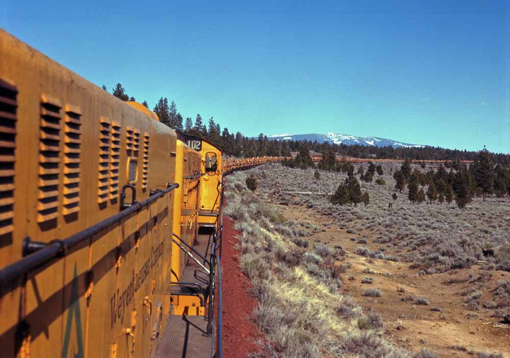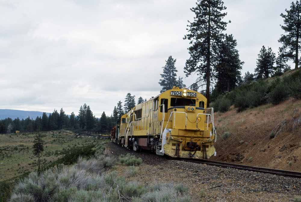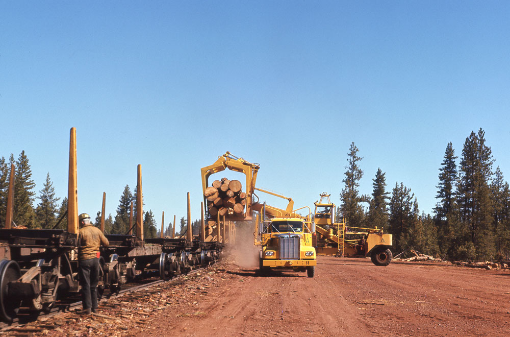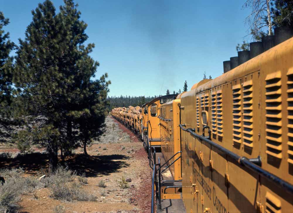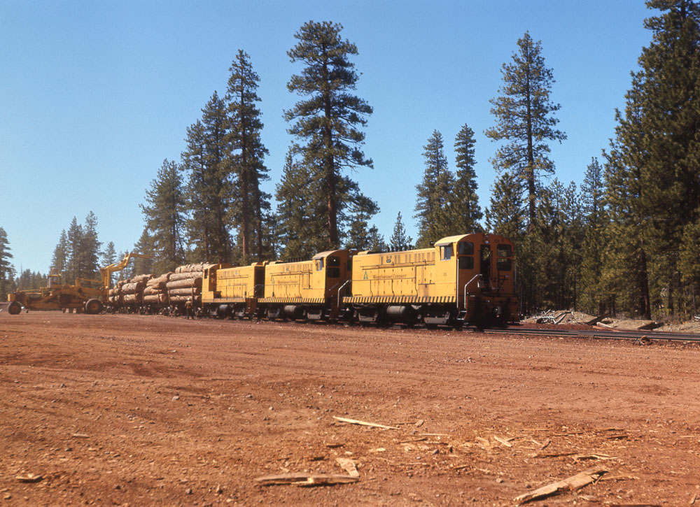 The second visit Charles made to the operation happened sometime between 1983, when Weyerheaeser replaced the Baldwins, and 1986, when Weyerhaeuser closed the Bly mill. This visit started with the #7604, #7603, and Weyerheauser #312 leading an eastbound freight crossing Highway 140 between Olene and Swan Lake. On the head end are a number of log loads being hauled to the Bly mill.