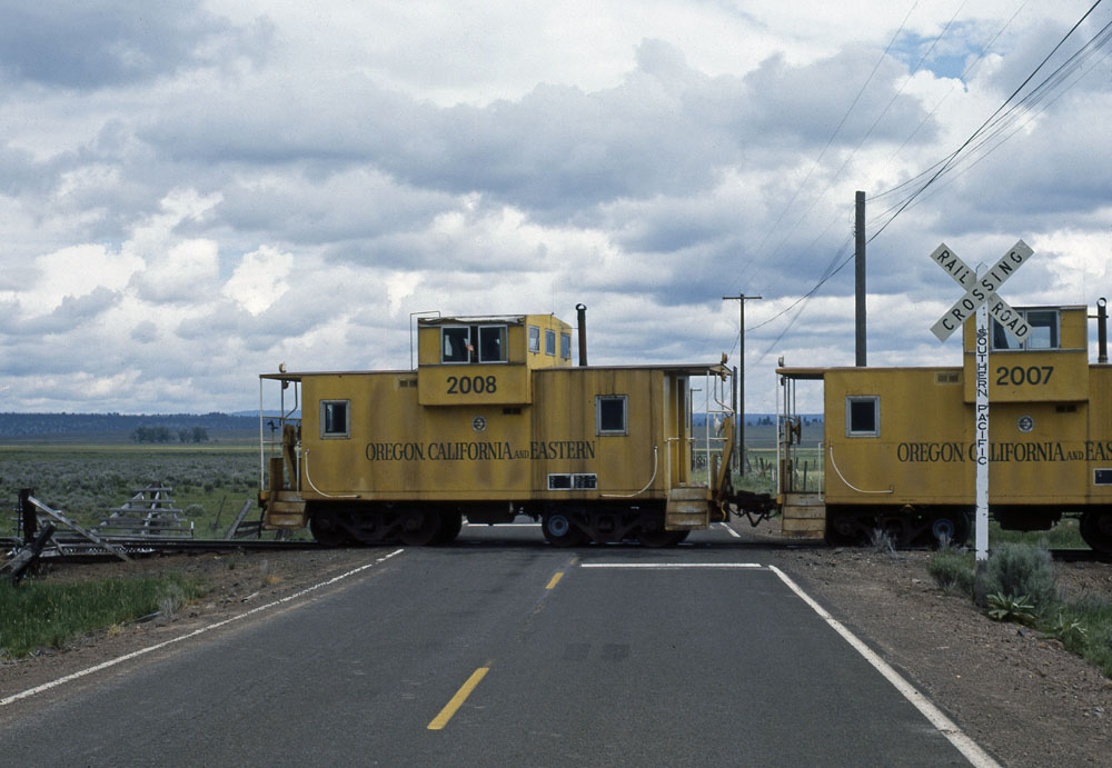 Another shot of the two OC&E cabooses crossing a highway along the line. |