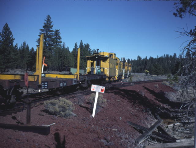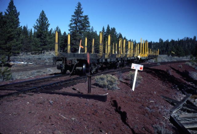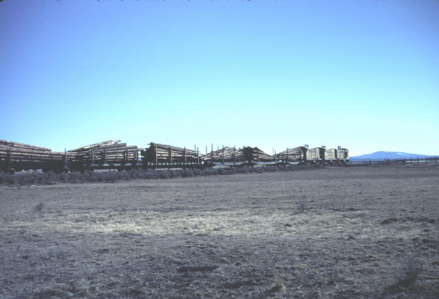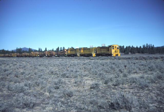 Later in the afternoon the crew has swapped the empty cars for loaded ones and is on the way back south toward Sycan. The small logs on the first cars behind the locomotives are bound for the sawmill in Bly; all other cars will go west to Klamath Falls. The train is rolling down into Sycan Marsh, between Camps 9 and 15. |
