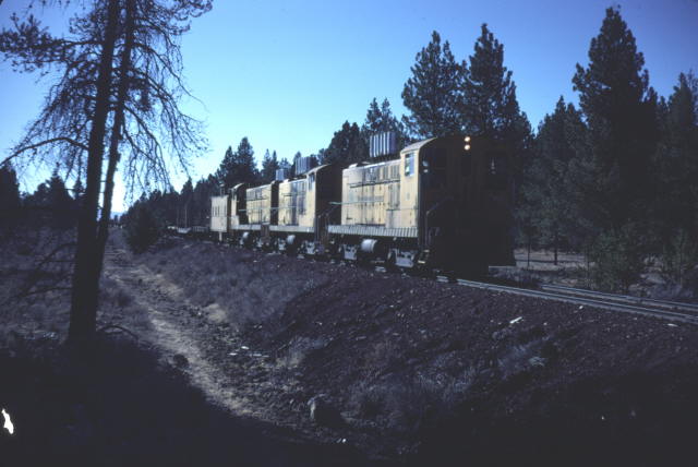 Three Baldwins lead a northbound train past the Camp 9 Junction. The caboose is carried right behind the locomotives to make switching at the reload simpler. |