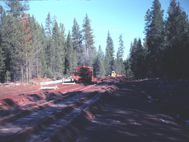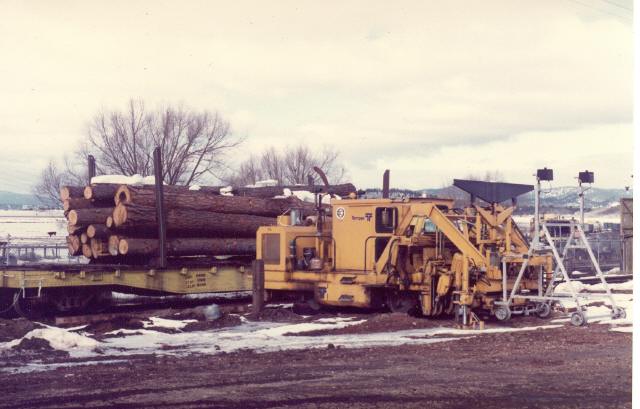 The tamper is seen here working at the Camp 6 Reload in November 1977. The tamper used lasers to make sure that trackage was properly aligned, and the green structure behind the machine is part of the alignment system. Photo by and courtesy of Jack Bowden. |