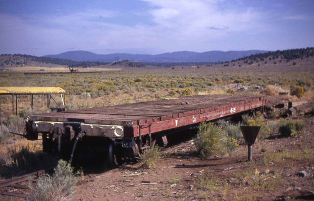 Weyerhaeuser flat car #45-35 at rest in the Sycan yards in 1973. Jerry Lampter photo, used with permission. |