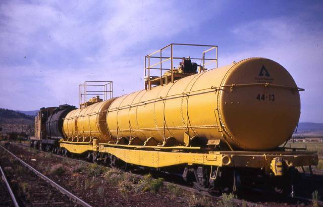Three Weyerhaeuser Timber Company tank cars coupled to a Baldwin switcher at the Sycan yard. Note the pump on top of #44-13. Photo by and courtesy of Jerry Lamper. |