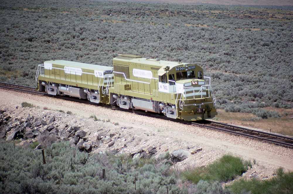 OC&E #7601 and slug #7606 undergoing final testing on the Union Pacific near Boise, Idaho, on 17 June 1976 just prior to being shipped to Klamath Falls. Jeff Moore collection. |