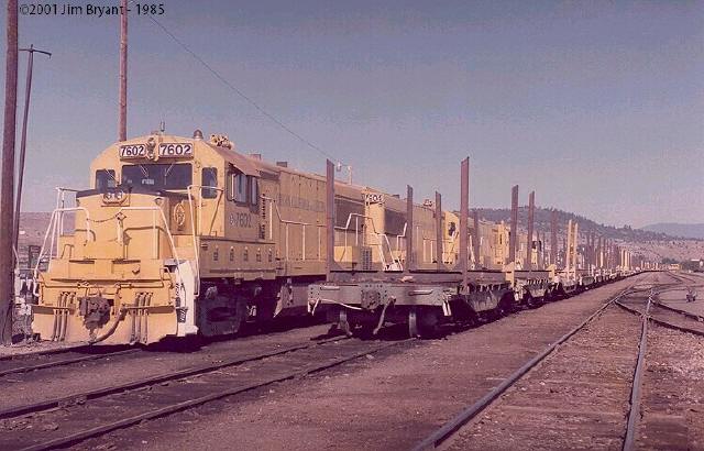 Oregon California & Eastern #7602 and three sisters are seen tied down in the Klamath Falls yard in this 1985 photo by Jimmy Bryant. |