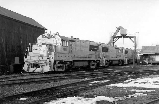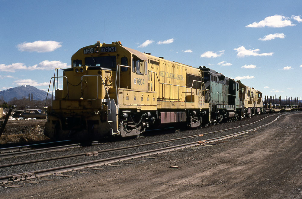 Oregon California & Eastern #7604 leading a train through the BN yard in Klamath Falls in March 1988. Lee F. Hower photo. |