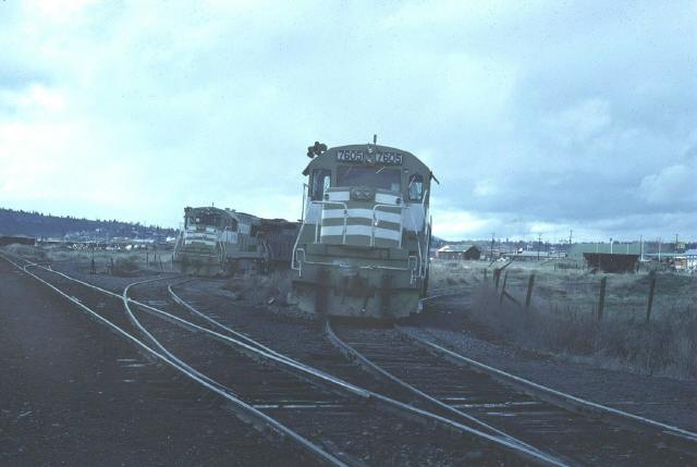Oregon California & Eastern #7605 leading a log train through the Burlington Northern's Klamath Falls yard en route to the Weyerhaeuser sawmill. Photo by and courtesy of Jimmy Bryant. |