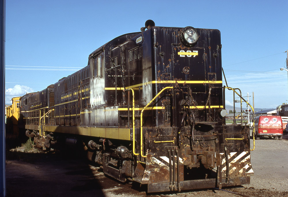 Escanaba & Lake Superior #207, the former OC&E #7908, in Wells, Michigan, on 20 December 1992. J.M. Seidl photo. |