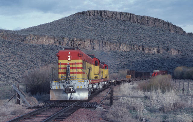 The #4 and a sister are seen here leading a northbound freight up the Poison Creek Canyon a few miles north of Burns. The train is about to cross Highway 395. Photo taken 22 March 1978 and is by and courtesy of Scott Anderson. |