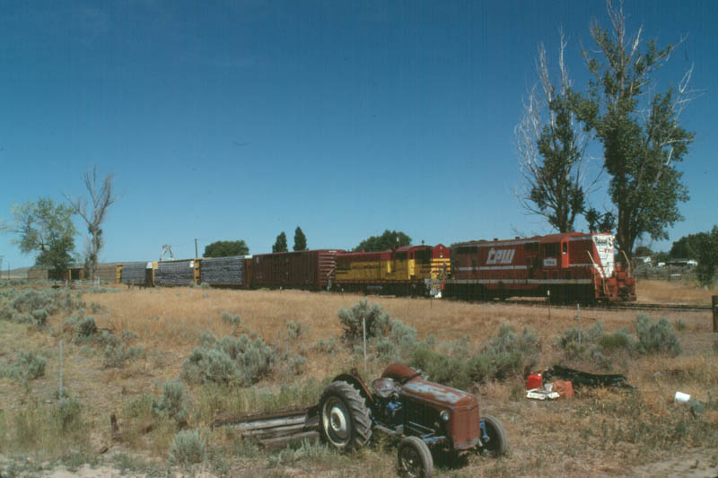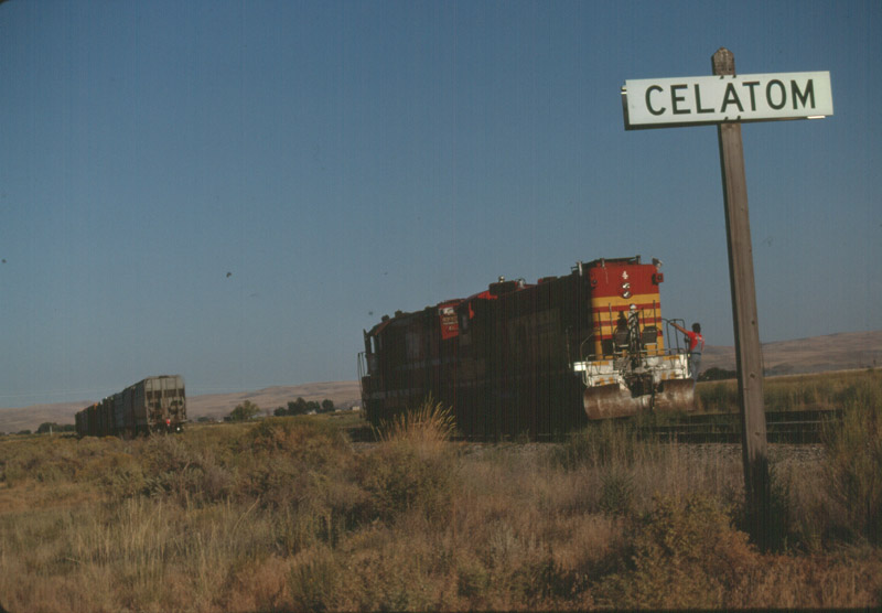 The eastbound train of 4 September 1991 is seen here switching the Eagle-Pitcher Diatomaceous Earth plant at Celatom. The #4 appears to be leading during some of the switching moves. A few more miles will bring the locomotive to the UP interchange at Ontario. |