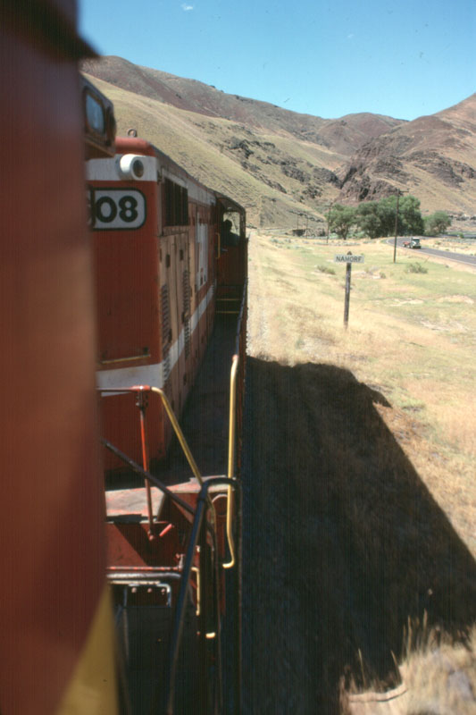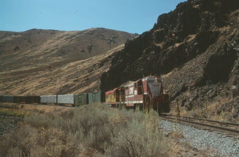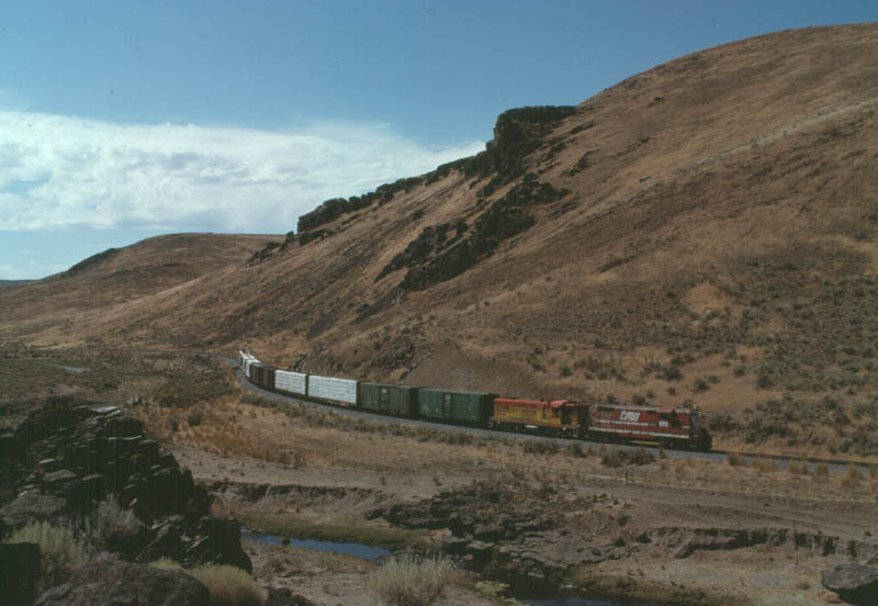 The eastbound train moving the #4 is seen here at the upper end of the Malheur River Canyon at Milepost 97.3, four miles west of Riverside and one mile east of the former station site of Fort. |