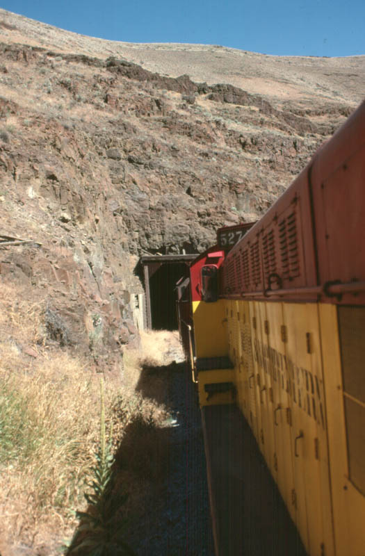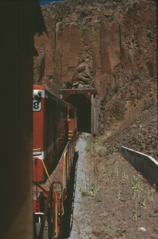 At Milepost 54.2 the Oregon Eastern passed through Tunnel #6. The west portal of the tunnel is seen here from the rear of the #3. Note the "5274" in the #3's numberboards- that is the original number it carried on the Southern Pacific before going to the O&NW. |