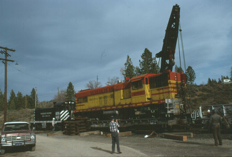 Oregon & Northwestern #4 arrived at Portola in the spring of 1992. The morning of 8 April 1992 finds FRRS volunteers unloading the locomotive from the flatcar using ex-Western Pacific 100-ton derrick #37. |