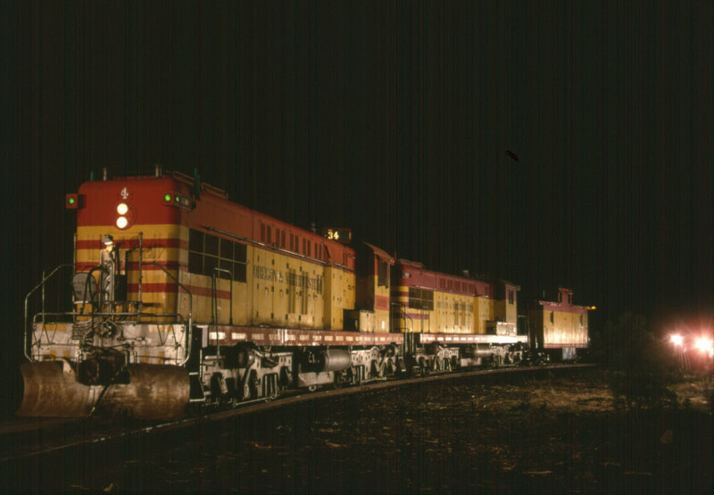 In a scene that could be on the O&NW years before, #3 and #4 along with caboose #300 are back together once again a year after departing central Oregon. The pair are seen here in a 5-minute time exposure taken during a night photo session organized by Vic Neves as part of the Railfan Photographer's Day on 19 September 1992. Time will tell if scenes like this will be repeated in the future. |