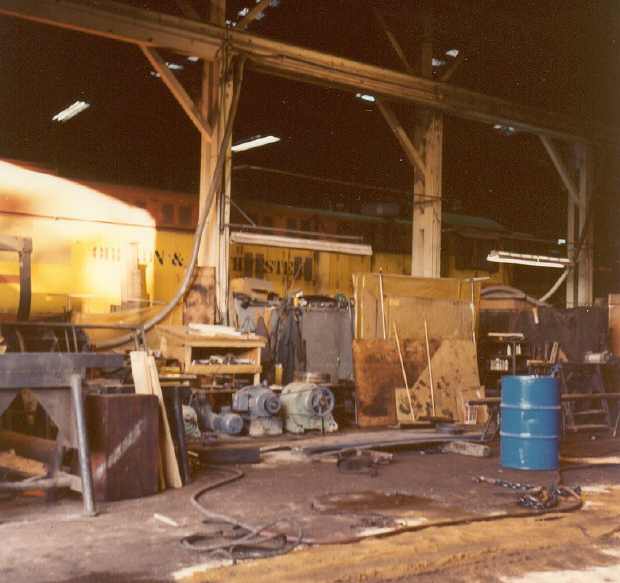 In July 1984, four months after the end of operations, Jimmy Bryant was granted access into the shop to photograph the diesels stored inside. The diesels would spend some time in the shop before being moved to one of the drying sheds, where they stayed until rescued by the Feather River Rail Society in 1990. Photo courtesy of Nevada Historical Society. |