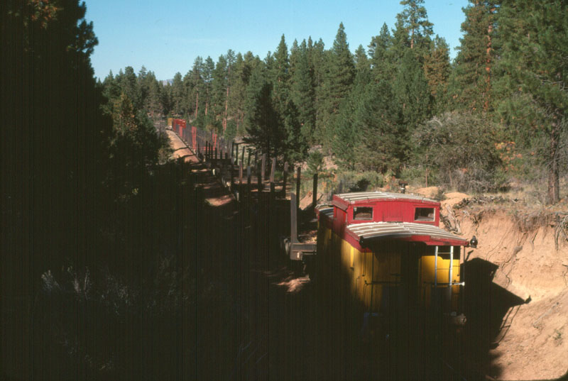 On 22 August 1977 the railroad granted Wayne a ride in caboose #300. This photo is looking backwards out of the cupola as the train rolls through Poison Creek at the foot of the grade up Poison Creek Canyon. Note the empty log cars in the siding and Highway 395 at the extreme left of the photo. |