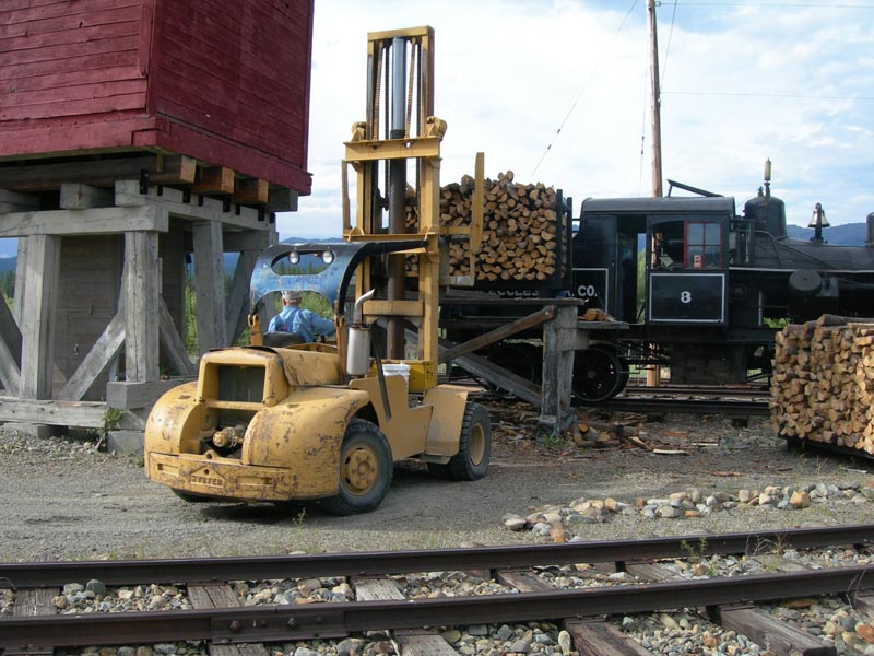 The railroad uses this forklift to place racks of wood on the platform; refueling the #3 is done by