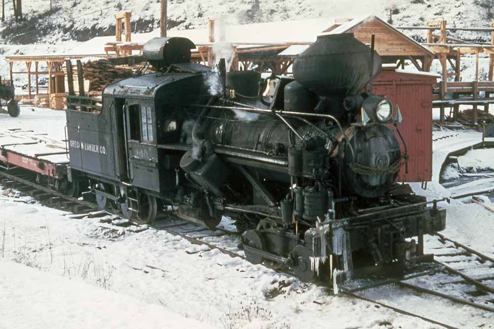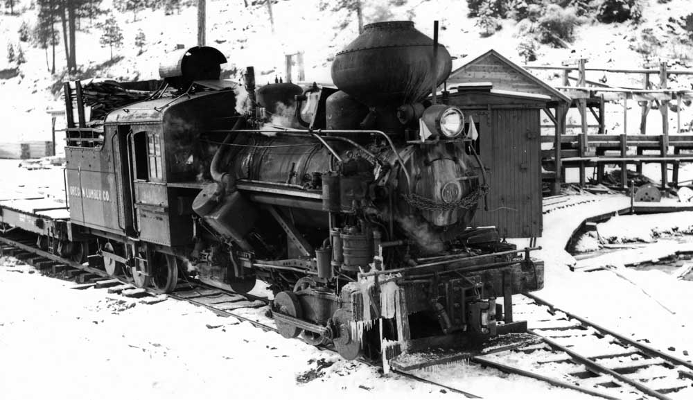 Heisler #100 at Bates on 3 December 1946. Note the hose reel on top of the cab and the counterweights mounted outside the driving wheels. John T. Labbe Collection of Logging and Railroad Photographs, 1892-2010, Washington State Archives, Digital Archives, http://www.digitalarchives.wa.gov.