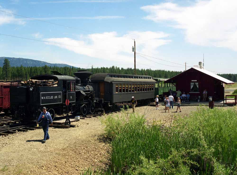 railroad dead line in Alaska and raised enough money to purchase the pair and transport them to McEwan. Donations continued to roll into the project. Union Pacific provided rails and track materials from two branchline abandonments in Oregon, specifically the Vale-Brogan and Weston-Athena branches. Crown Zellerbach donated a small diesel locomotive and some rolling stock from an in-plant switching railroad at a sawmill that company owned in Camas, Washington. Members of the David Eccles family learned of the project and made substantial donations to the group, allowing it to pursue additional aquisition, expansion, and restoration efforts. And, finally, the Edward Hines Lumber Company deeded the right-of-way over to the restoration group. The railroad finally realized its short term goal of returning to Sumpter in 1991. Development in Sumpter since the original railroad quit obliterated the last part of the original grade into town, which forced the restoration group to develop their own. The group obtained the final parcels of land needed for the right-of-way in 1990, and the first train back into Sumpter operated on 27 April 1991. Heisler #3 and the small diesel handled all operations through the first two decades of the new Sumpter Valley's operations. In 1992, the group secured enough grant money to make restoring one of the repatriated mikados feasible, and the #19 departed on a truck bound for the Daylight Locomotive Works in Portland, Oregon. Restoration of the #19 consumed four years and a quarter million dollars. The debut of the #19 in July 1996 gave the railroad two functional steam locomotives with which to power operations. The group at the same time completed a large and well equipped shop building to provide space to house, restore, and maintain equipment, which has grown to include equipment from narrow gauge operations all over the north American continent. |