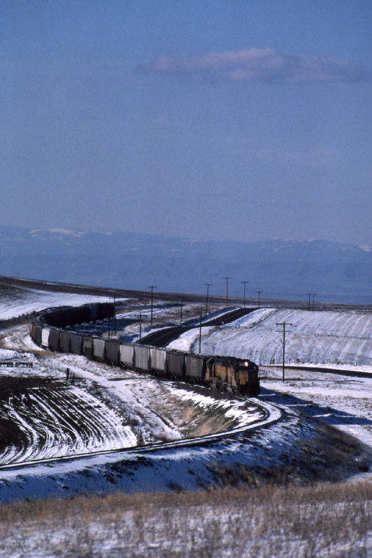 A loaded trash train rolling up the Condon Branch towards the Gilliam County landfill. Photo by and courtesy of Robert W. Scott.