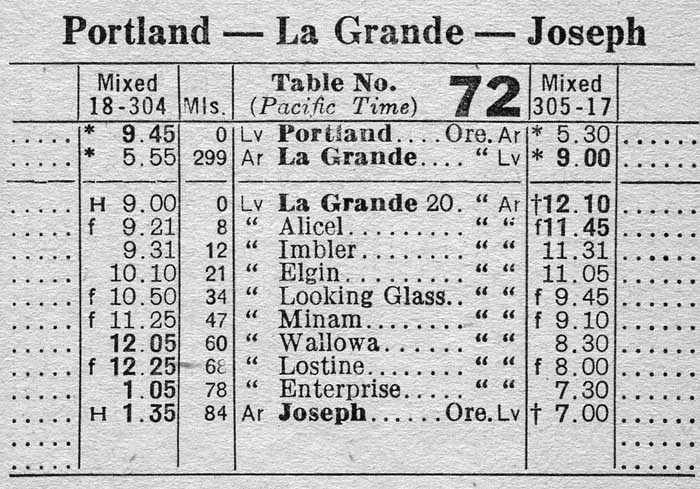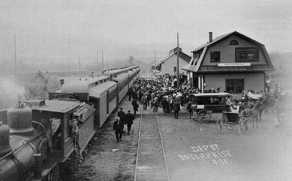 A Union Pacific train at the Enterprise depot shortly after the line's construction. In 1890, the Oregon Railway Extension Company completed a branchline running twenty-one miles from a connection with the UP mainline at La Grande northeast to the town of Elgin. In 1905, the Oregon Railway & Navigation Company commenced extending the branch beyond Elgin, with an eventual terminous of Joseph, Oregon, reached in 1908. Total mileage from La Grande to Joseph stood at 84 miles. The La Grande-Elgin section of the line generated a substantial amount of agricultural traffic. Beyond Elgin the line tapped into a heavily forested part of Oregon, and forest products quickly came to dominate the traffic base. The scenic attractions of the Wallowa Mountains drew a lot of tourists, and as late as 1960 Union Pacific still ran a daily-except-Sunday mixed train up the branch, with Train #304 making the La Grande to Joseph run and Train #305 making the return journey. The schedule allowed Train #304 four and a half hours to make the run, with the return trip allowed a little more than five hours. Freight traffic remained healthy into the early 1990s, with a series of sawmills in Enterprise and Joseph providing most of the traffic. UP served the branch with a local that operated three trains a week, running up to Joseph on three of the days and returning to La Grande on the alternate days. Despite the relative prosperity, the line stood out as a prime candidate for a shortline spinoff, and in 1992 UP offered the line as part of a package including several other branches in Idaho. Rio Grande Pacific Corporation won the bidding process, and on 14 November 1993 the new company took over. Under the final arrangements, Rio Grande Corporation leased the La Grande-Elgin trackage and purchased the Elgin-Joseph trackage. Rio Grande Corp. set up the new Idaho Northern & Pacific Railroad to operate the line. |