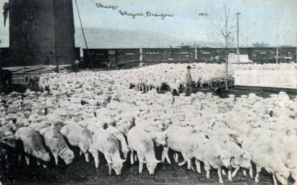 ![]() While forest products dominated the traffic base, the Joseph Branch also generated substantial agricultural traffic especially on the La Grande to Elgin section. Sheep are seen here being loaded in Elgin. Jeff Moore collection. |