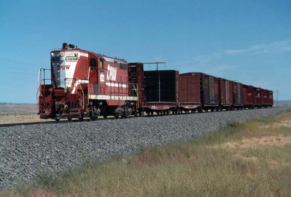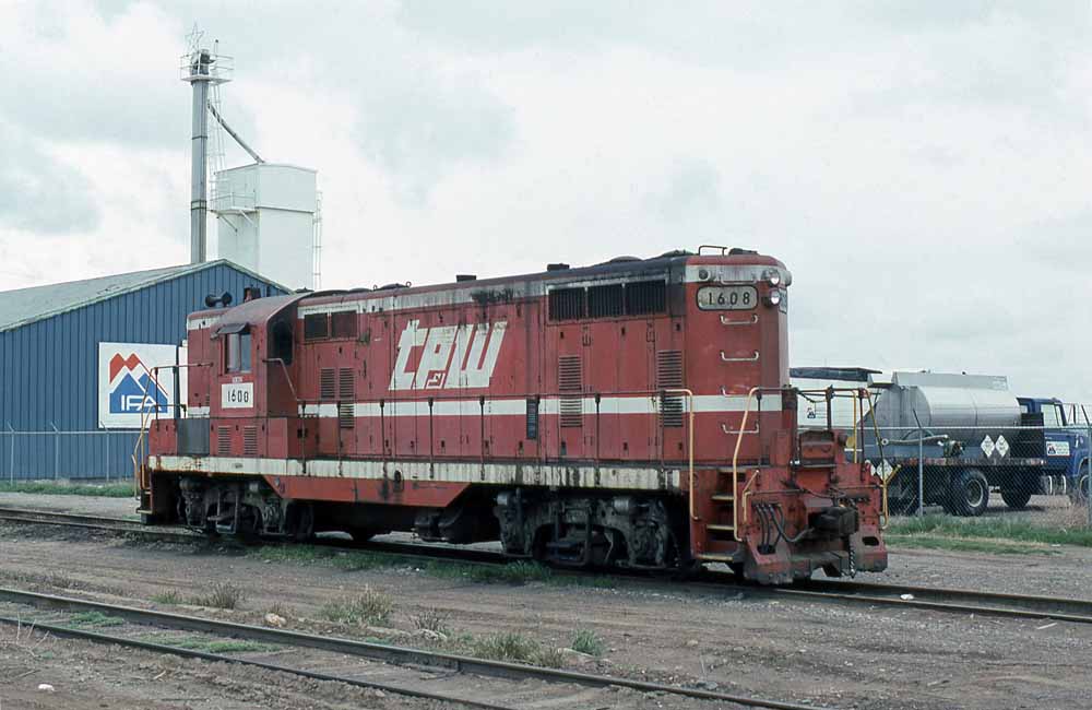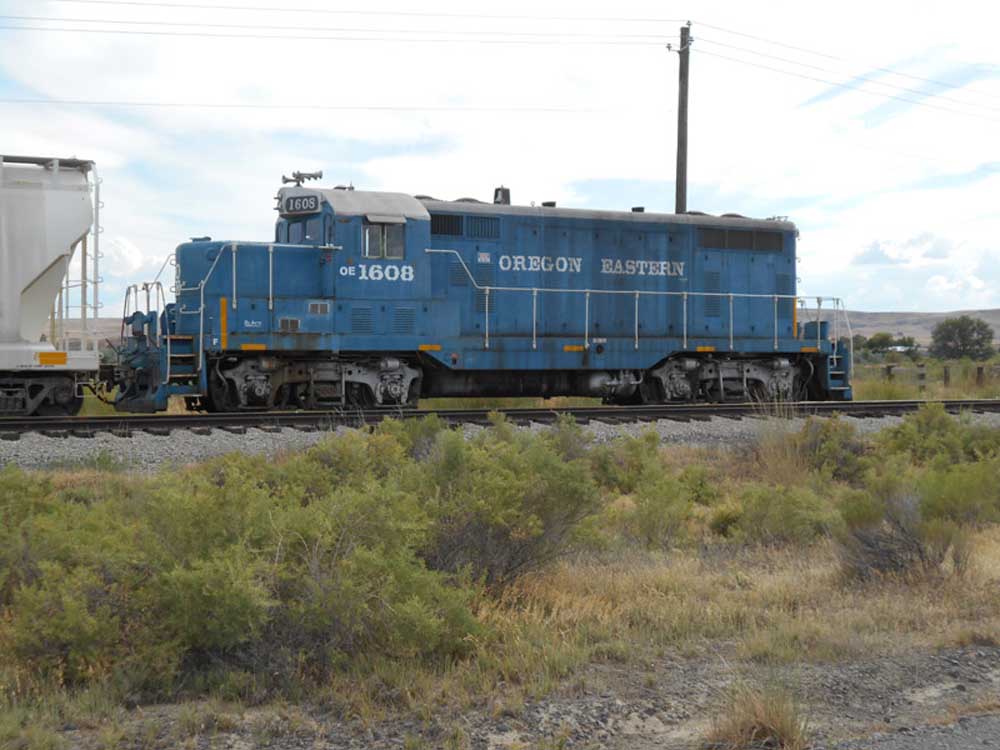 Oregon Eastern Division of the Wyoming/Colorado Railroad locomotive #1608 is seen here leading a westbound train at Milepost 139, near the old Lawton station site on 3 September 1991. Photo by and courtesy of Wayne Monger. |