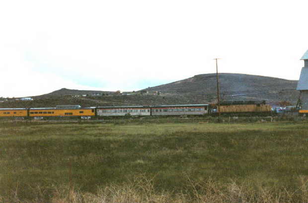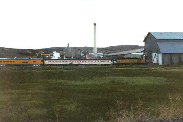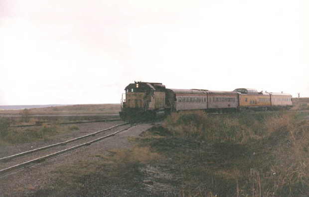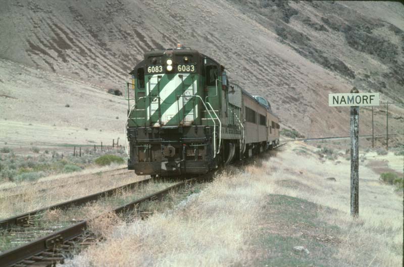 WYCO #6083 leads the re-railment special is seen here on the westbound trip between Ontario and Juntura on 30 May 1990. The location is the Namorf siding at Milepost 51.4- Namorf is derived from spelling Foreman backwards. Vic Neves photo, courtesy of Wayne Monger. |
