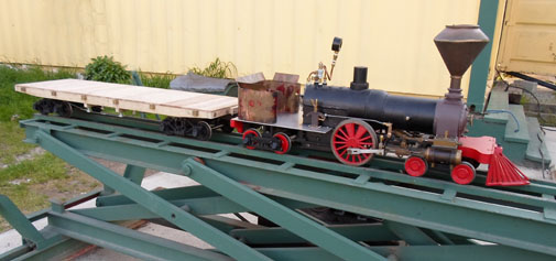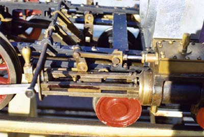5/5/13 Cab floor has been completed and reverse lever has been installed. The linkage from the lever to the value gear required a lot of trial and error fiddling as it needed to bend around the drive wheel and up to the reverse lever. At this point I was able to test the engine by taking it down to the club and attaching a hose to fill the boiler with compressed air. Running back and fourth several times I found the locomotive to be a bit slippery but once it gets moving it has no problem pulling me and a tool box. Another test was run with a small passenger and the engine again was able to pull the load without struggling. I did find several leaks - the gaskets in the steam chest, cylinder heads, plus the bolts that held the firebox door had the largest leaks. Several months later I had solved the leaking firebox door bolt problem plus replaced most of the gaskets in the cylinders and steam chest. The engine performed a bit better when I tested it again at the club.