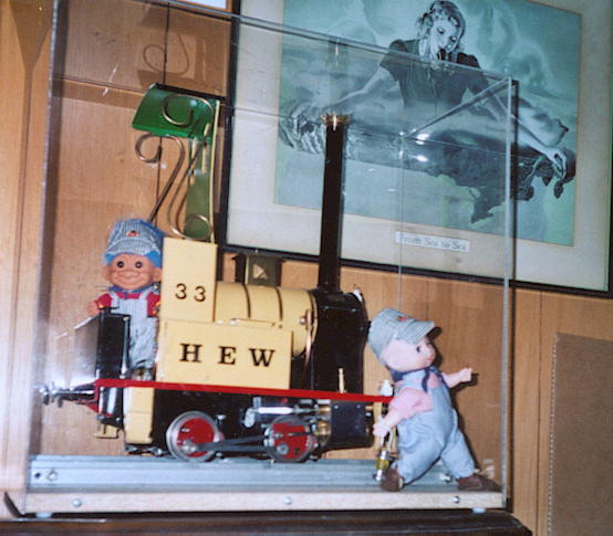 At the time of the "Tich" plans were being published in "The Model Engineer," a cartoonist named Rowland Emett was also publishing caricatures of Live Steaming and trains in general in the humour magazine "Punch." I think Jack got the Emett drawings and the Lawrence drawings mixed up as he built this engine! Not to be outshone by her husband, Ivy Hewitson stitched up the engineers' costumes for "Steamer" the engineer (in the cab) and "Achy Brakey" the brakeman (at front.)