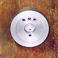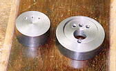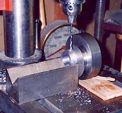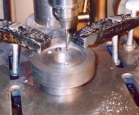 Turn the eccentric around in the jig. Put in the three bolts, and tighten. You will notice that both sets of boltholes in the eccentric jig are countersunk, so that the capscrews are always below the surface. Drill the axle hole out. Note that the fourth mounting bolt hole is there - do not drill through it, because the drill will wander,