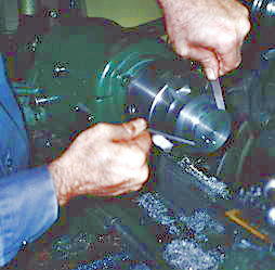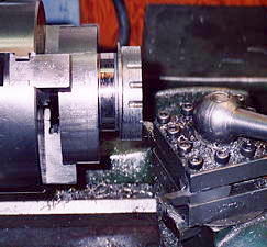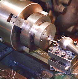 Change to a narrow round-nose bit, turn down the running surface to diametre, then take a strip of emerycloth and polish it up to a mirror surface. You want the lathe humming on this operation - I used 1260 rpm, because that is as fast as she'll go.