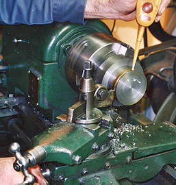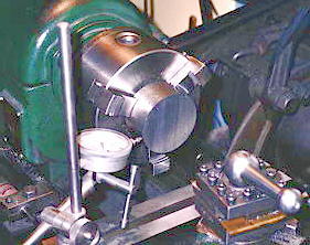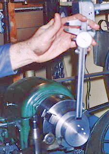 . . . is measured with the depth finder on the end of a dial vernier, or using calipers. You want the part diametre to be several thousandths less than the finished diametre of the eccentric strap. In this case, we indicate 0.258" deep, giving us a finish diametre of 1.984".