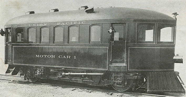 A steam locomotive pulling a single coach requires a crew of four - engineer, fireman, brakeman and conductor. It may have more crew than passengers paying the way on less travelled routes. In 1904, Harriman, the motive power super' of the Union Pacific, wanted to improve the cost-effectiveness of these short-haul passenger runs. He approached the Chief Mechanical Engineer, William McKeen, with the problem. McKeen built a gasolene driven self-propelled passenger car - the first of its' type in the world. It was a four-wheel car, with a wooden body and a boat engine mounted across the front axle. It was "Streamlined," shaped like a reverse teardrop, with a pointed nose and rounded tail.