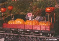 Pumpkin gondola and load of pumpkins. Two red LEDS