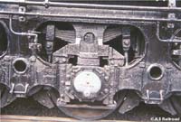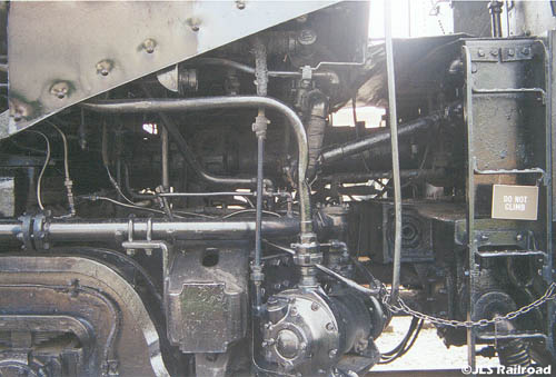 Left side of locomotive to tender connections. Note the automatic steam powered coal auger.