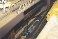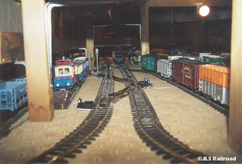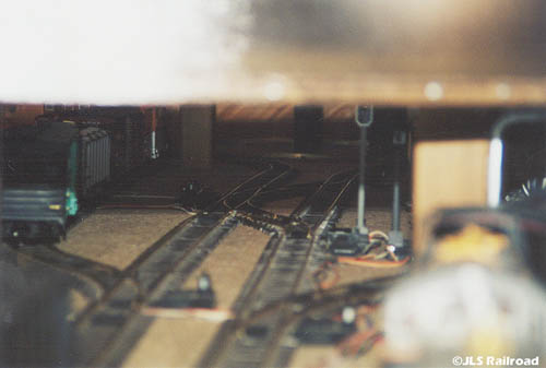 The following extension was planned by Randy Knaub and carried out by Skip Densing and Jonathan Landon (myself). Prior to this extension, in order to turn a train around, from Southbound (our normal direction of travel) to Northbound, or visa versa, a lengthy trip up the Helix was necessary to access the large reverse loop atop the table in the H-Yard. If a fast turn-around was needed, this much traveling proved to take too much time. With the addition of this simple set of turnouts, an interchange was formed between the 2nd and 3rd Line, forming a reverse loop due to their arrangement.